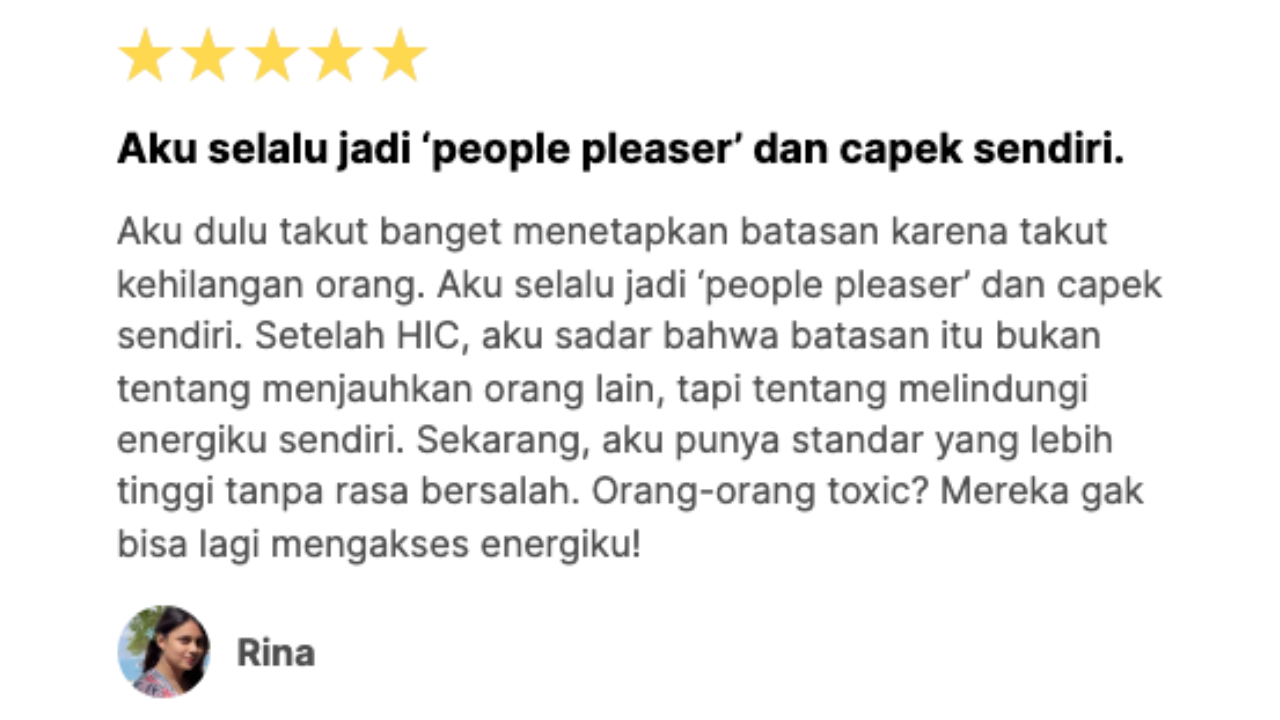 "Aku selalu takut bilang ātidakā, selalu jadi people-pleaser. Sekarang aku bisa menetapkan batasan tanpa takut ditinggal atau merasa bersalah. HIC bukan cuma teori, tapi bener-bener ngerubah aku dari dalam."Ā - Nadine, 26